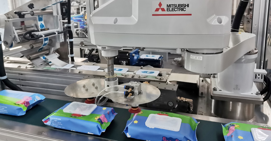 本機(jī)使用三菱機(jī)器人高剛性機(jī)械臂,視覺識(shí)別技術(shù)、傳送帶跟著技術(shù)等完美結(jié)合。在線可以完成自動(dòng)取蓋、貼標(biāo)、涂膠、粘蓋等一系列動(dòng)作,更換蓋子規(guī)格時(shí),在觸摸屏操作切換。節(jié)省人力,從而降低用工成本。極大地提高生產(chǎn)效率和產(chǎn)品合格率。